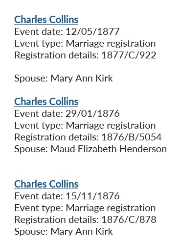 Charles Collins married Annie three times in all. Initially, on 29 January 1876, when she called herself Maud Elizabeth Henderson, then on 15 November 1876, and then finally on 12 May 1877. She called herself Mary Ann Kirk on the final two marriage registers. Charles Collins must have loved her to marry her three times, and under two names.