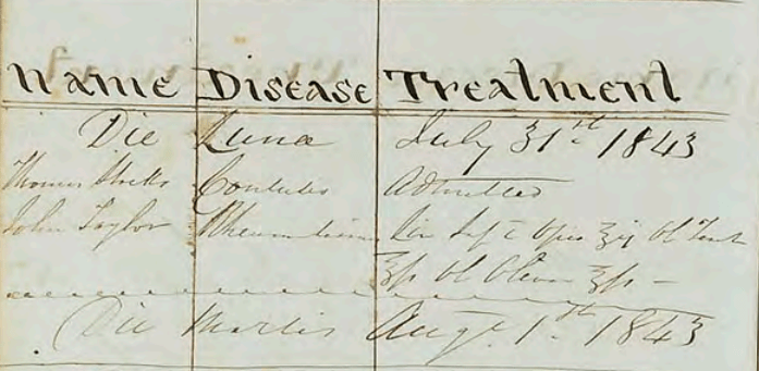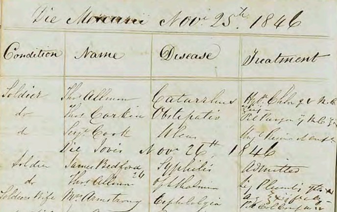 Minor outbreaks of disease were clustered. If one soldier suffered from catarrh, the entire barrack-room was being treated for it by the end of the week. March 22, 1845 saw ten men turn up to the outpatient clinic with diarrhea (considering the population was still very small, that’s an outbreak).