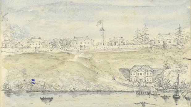 Brisbane Town 1843, showing the convict buildings, including the hospital.