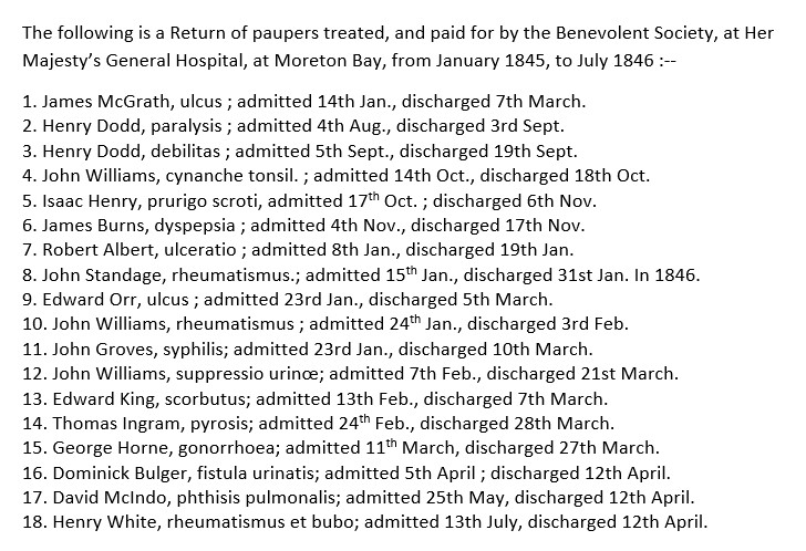 The free settlers coming to Moreton Bay were not necessarily well-off. Former convicts, labourers and servants did not earn enough to afford private medical care and the hospital had been instructed to admit free persons on a fee-paying basis.