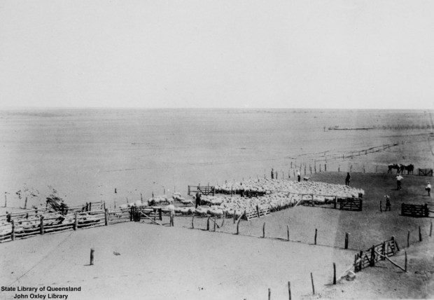 Sheep being mustered for shearing at Eulolo Station (undated).