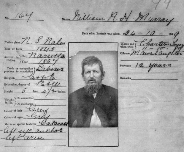 A look at the Record Sheet shows that this man is William N.H. Murray, aged 44. He looks much older. He had been convicted of manslaughter earlier that month – October 1889 – at Charters Towers.