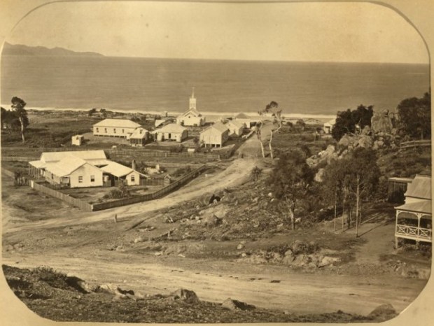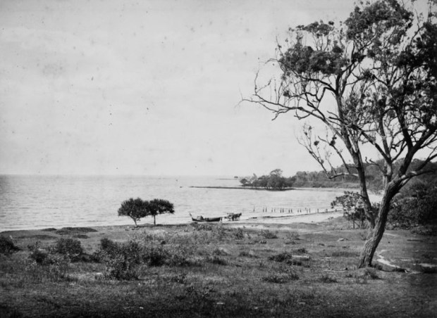 Townsville Beach and Hinterland. Nervous swimmers must have been comforted by the presence of a church at the sea’s edge. c. 1890.