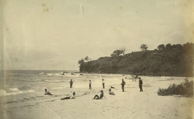Once one had endured the jolting ride through the rutted scrubland track to the beach, one could lounge, fully dressed and sensibly hatted, on the sand. 1882-8.