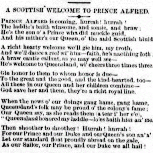 “Meantime, as when our feelings are up, we sometimes like to give expression to them in song, I have strung together some verses which we may croon over till we get something better. Try “Prince Alfred’s Welcome” now, and alter it to the time present when he comes, and excuse yours truly, FREDERICK CUMMING.”[xxi]