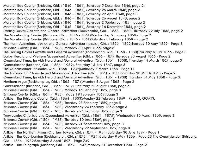 “The late crusade of the police against the goats ended in the capture of a number of billies, found straying in the streets at night; and great was the grief of a number of juveniles who were thus deprived of the animals they had been in the habit of riding, the boys who owned the goats might have been seen looking at their favourite steeds in the pound with affectionate feelings. When told that whoever owned the goats would be summoned, they grew shy, and the public may anticipate an announcement shortly, that there are a number of the goats for sale, the highest bidders to be the purchasers with the prospective possibility that the buyers may find themselves in the position which the late owners have wisely evaded.” The Moreton Bay Courier, March 1860.