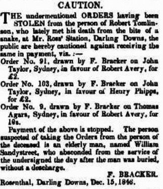 FATAL OCCURRENCE.—A short time ago, a Robert Tomlinson, a farm servant in the employ of Mr. Neill Ross, of Darling Downs, was reaping in the wheat paddock, a green snake bit him on the hand. On finding himself wounded, the poor fellow immediately proceeded to Mr. Ross’s residence, where every assistance was rendered; but as he positively refused the courageous offer of Miss Mary Ross to cut out the wounded part with a razor, human aid was of no avail and after suffering the most excruciating pains, he shortly expired.