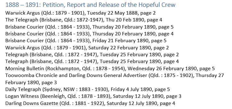 There was a triumphant reception planned in Brisbane by supporters of the Hopeful’s crew, but it was quietly abandoned when cooler heads suggested that the men had been convicted of crimes in the labour trade, and that a party in their honour might be a bit too much.