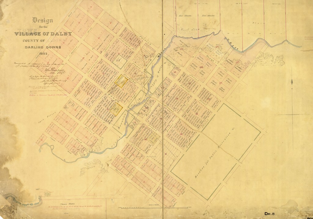 This was the beginning of the town of Dalby in 1853 – a plan that showed the selections of land made by the township’s earliest European inhabitants. All of the storied names of 19th century Dalby are there – Charles Douglas Eastaughffe, future Chief Constable; Alfred Peter Gayler, hotelier and civic activist; and John Sidney and F.W. Roche, noted merchants. There were also three people named Whalin, who selected vast amounts of land – Joseph, Theresa and Winifred Whalin – who, together with their neighbour, Josiah Milstead, made Dalby a destination for more than a decade through the Plough Inn, the biggest and finest hotel in the town.