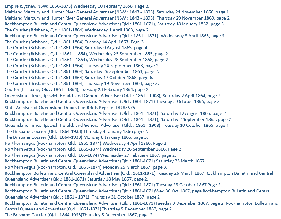 Edward Hartigan was properly recaptured in October and was very securely manacled henceforth. He was brought to Rockhampton to face charges of escaping from lawful custody, assault and horse stealing at the January 1866 Assizes. The press speculated on the length of the term the rogue would get. After months of remands in 1866, during which the prosecution failed to arrange its witnesses, all charges were dropped – even the escape from the Springsure cells. Hartigan was free.