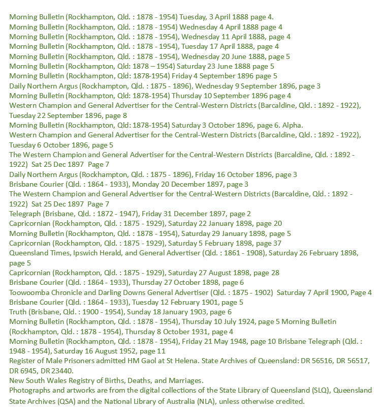 In February 1894, Hartigan was arrested again, and committed from Rockhampton to Springsure for trial. Springsure was now worthy of its own Circuit Court sittings, and at them, the Snob received 23 months for forgery and uttering. The best that could be said of the experience was that he didn’t have to face Rockhampton Court on that occasion. He was sent to Brisbane and admitted to the Brisbane Gaol at Boggo Road, aged 59.
