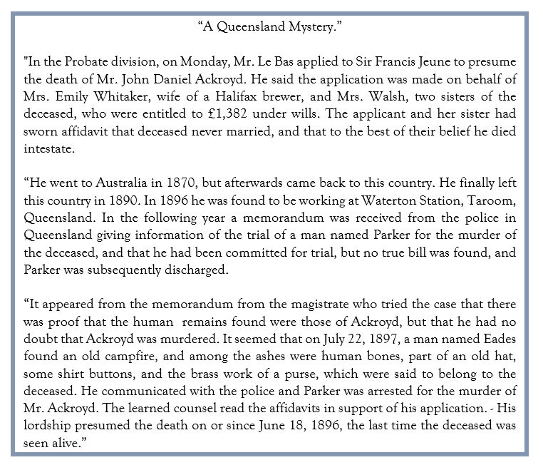 In 1900, John Daniel Ackroyd was legally declared presumed dead in the probate courts of London: