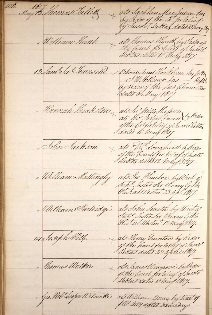 Mattingly found himself in Fleet Prison for a time. The Fleet Prison was used to house debtors and bankrupts. Some prisoners brought their families to live with them, some came and went (paying a fee to the gaoler of course), others lived in uncomfortable squalor in cramped cells. Mattingly was released in time to return to Berkshire and marry Mary Ann Keats in October 1818.