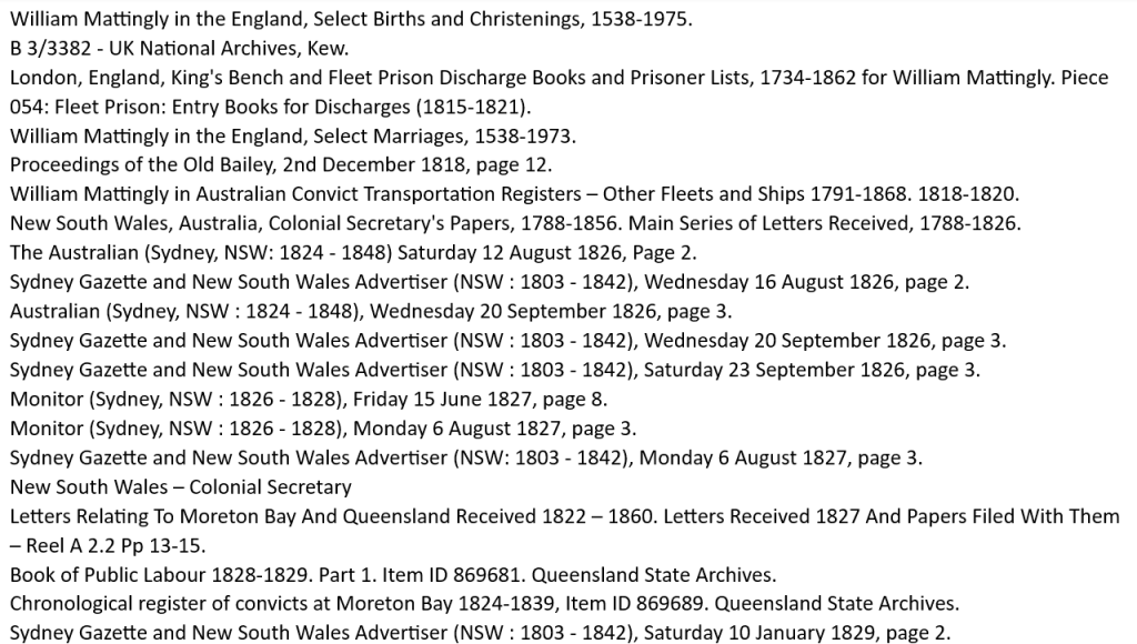 Wells and Redfern were put on trial, with Mattingly as a star witness, in August 1827. The counsel for the defendants put Mattingly through first a voir dire, then a searing cross-examination, then produced a string of character witnesses who all opined that they wouldn’t trust Mattingly if he told them the sky was blue. The defendants were found not guilty and were discharged by proclamation. William Mattingly was forwarded to the Hulk, then to Moreton Bay on the Isabella on 17 December 1827.