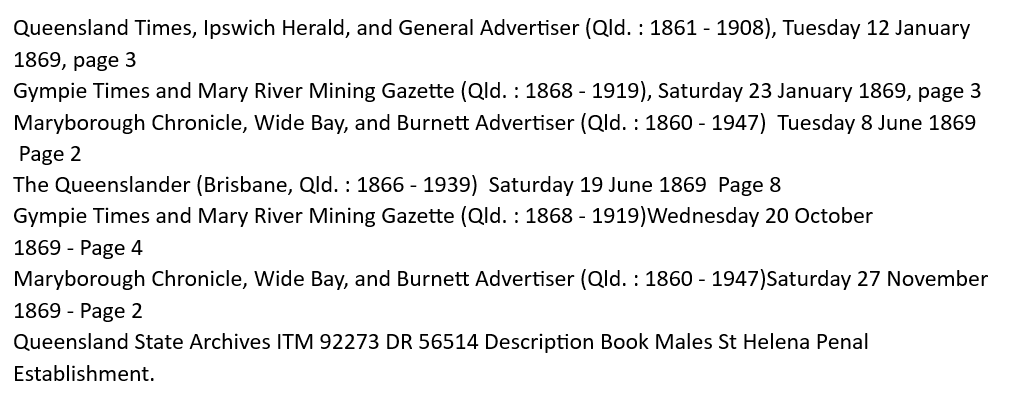 As Bond went to trial in Maryborough in October 1869, Palmer was tried the same month in Rockhampton, and was sentenced to death. Palmer’s death sentence was carried out at Rockhampton Gaol in November 1869. Bond ended up at St Helena Island, where his admission register showed that he was a sailor aged 41, a recent arrival from England, 5 feet 4 ¾ in height, medium build with a dark complexion, brown hair and grey eyes. It was noted that he had a scar across his temple, some teeth missing, and a gunshot wound on his ribs.