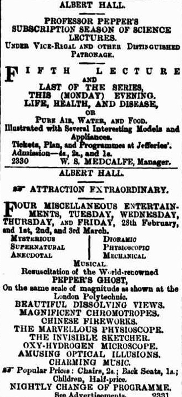 “In the course of a chat with the ruddy-faced white-haired Professor a representative gleaned from him some interesting reminiscences and reflections. “It is exactly ten years,” said the erstwhile Prince of the Polytechnic, since I left London, where my ghost performance sprang into popularity about a quarter of a century ago. I and my family have been living at Brisbane, Australia, for the last ten years, and my wife’s health was the chief reason of our return. We had a large and comfortable ‘place’ out there. Neighbours would often send in, asking’ me to let them have half a dozen trees, which I gave with as little thought as if they had been cauliflowers in England. I was appointed analyst to the city and used to have fine fun when people tried to bribe me-all in vain, of course-not realising that all samples reached me simply with a number attached, affording no clue to identification. I lectured a little, including some lectures of a more serious scientific character than I usually give. And, by the way,” he continued, “that reminds me of one of the leading principles of my old entertainments at the Polytechnic – I have always tried to steer the ship so as to give plenty of entertainment, while never forgetting the freight of science that we had to throw overboard. Had it not been for weak management, the old Polytechnic would still be in existence and flourishing. But £30,000 was lost there in fifteen years, and that is not a small sum; considering it, I have all the more admiration for Mr. Quintin Hogg’s lavish outlay; it is not every day in the week that one comes across such a man.”