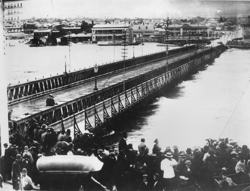 Crowds gathered to see the Victoria Bridge in flood. (SLQ)