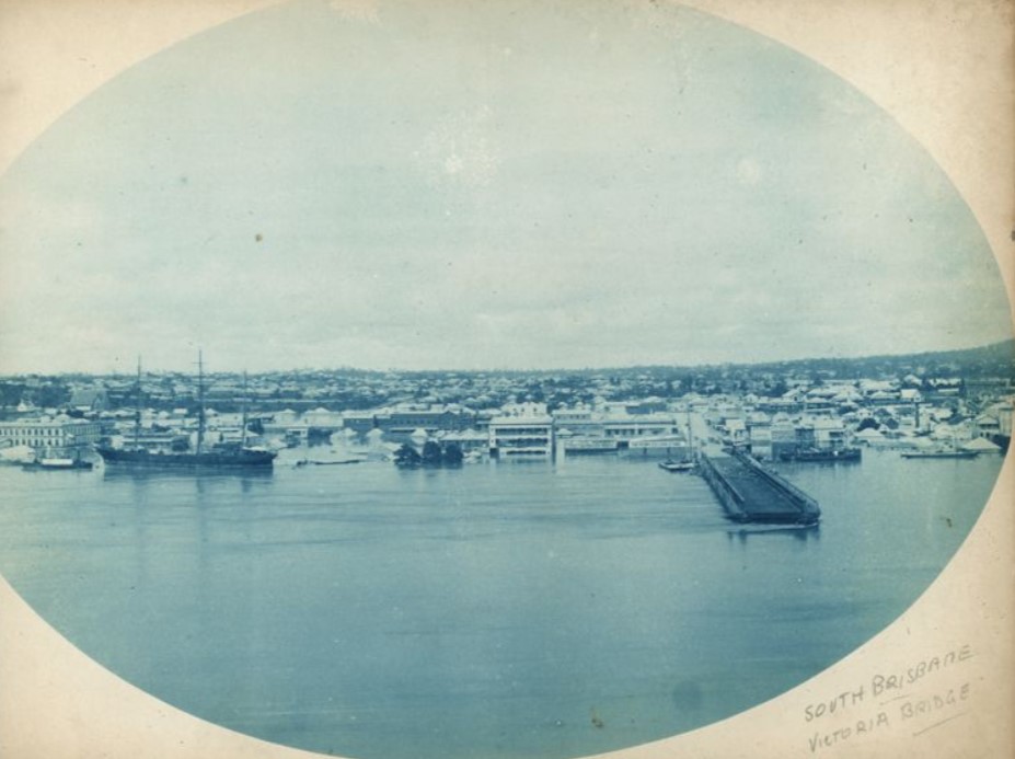 View from North Brisbane, showing the damage to the Victoria Bridge. (SLQ)