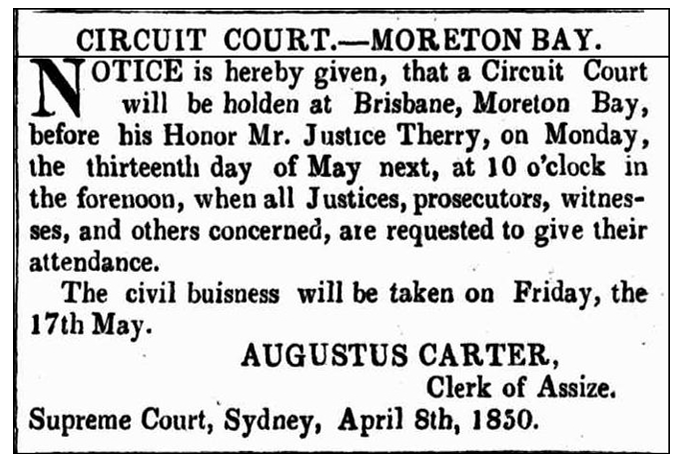 On 10 February 1850, a Circuit Court for Moreton Bay was proclaimed by His Excellency, and in May, the steamer Eagle made a slightly delayed entry into Brisbane Town with its judicial party.