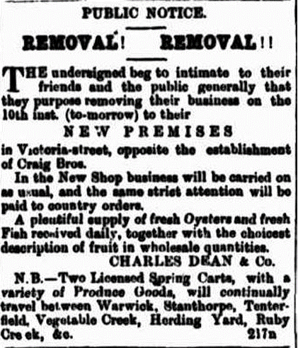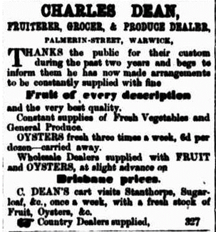 Charles Dean’s business thrived in Warwick. He offered a comprehensive variety of fresh produce, wholesale and retail, and his cart visited towns in the Southern Downs region each week.