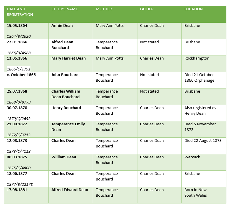 Temperance may have spent some time apart from Charles after the affiliation case, and the ructions in the Dean/Potts union in 1866 and early 1867, but they were back together for the birth of Charles William Dean Bouchard in 1868. In a court case in 1870, Temperance states for the benefit of the court that she lived with Charles in Rockhampton. She was a game young woman, living openly and having children with a Chinese man in the late 1860s. She must have been incredibly relieved when Charles was willing and able to marry her in early 1871.