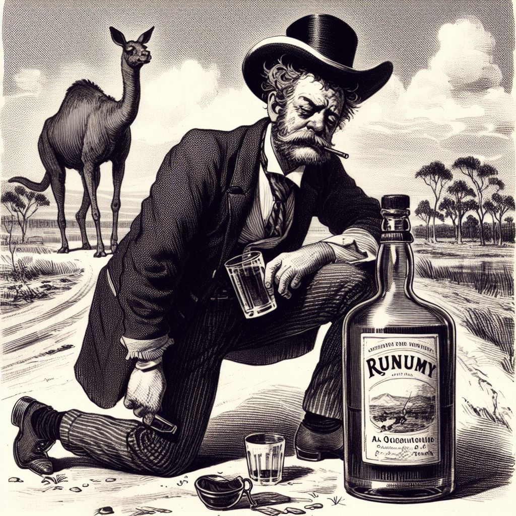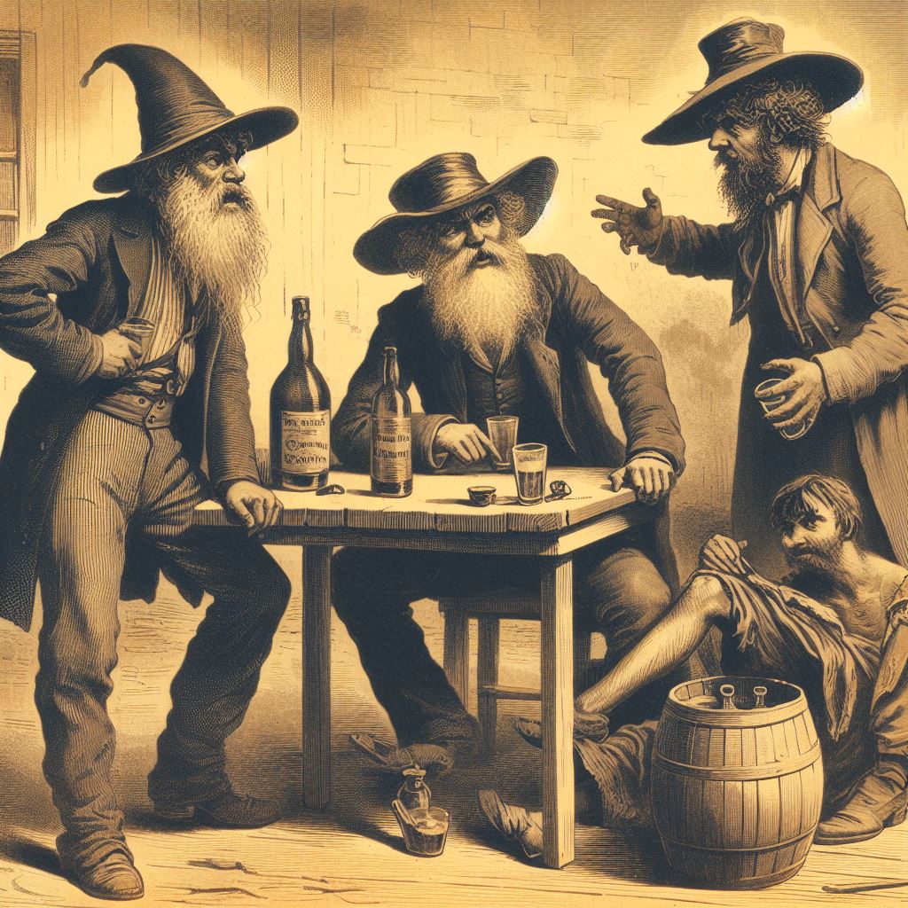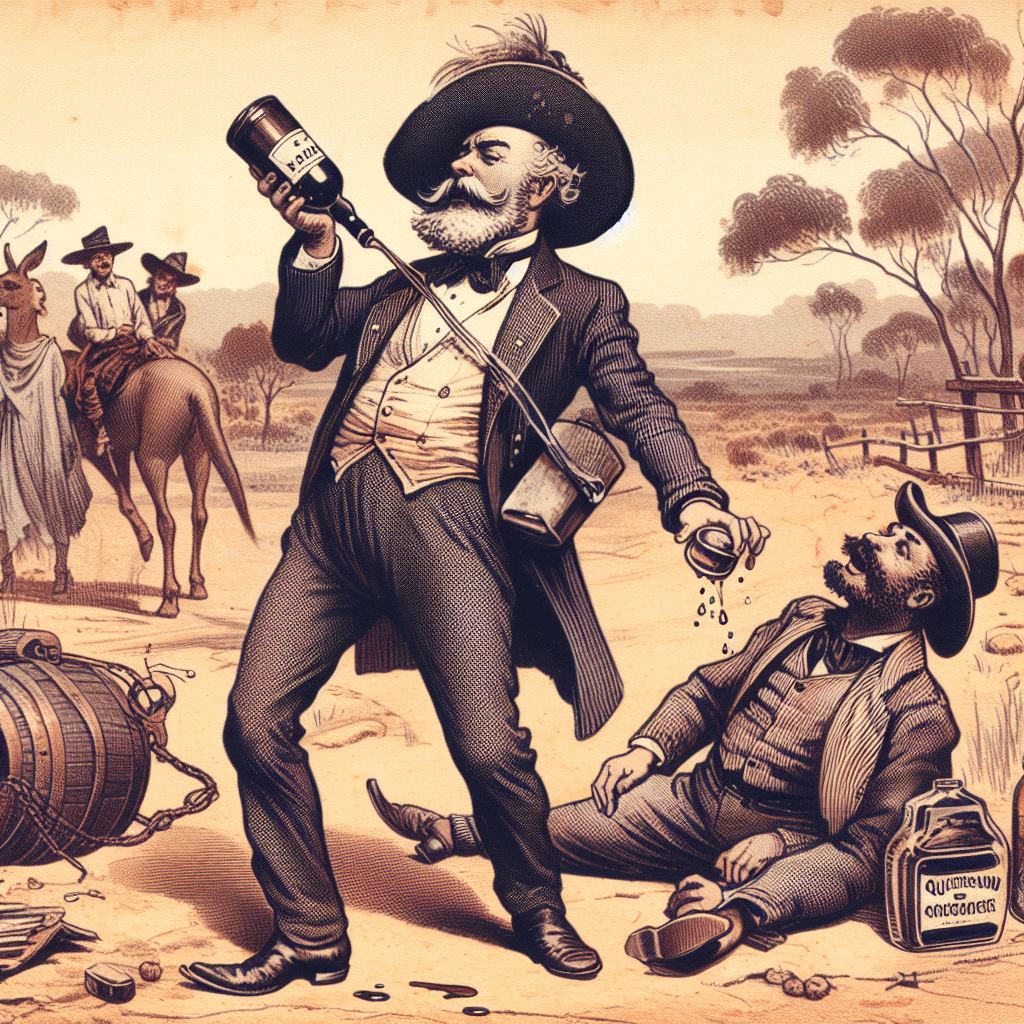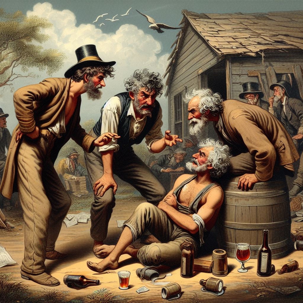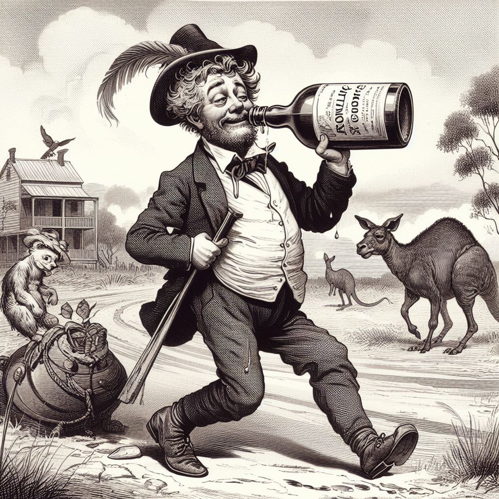 The first story, that of the drunken man who sells his horse for too little, then argues with the buyer and her friend, made me think that “two harridans arguing with a drunk man, 19th century Australia” might be a good starting-off point. I don’t think that AI quite knew what a harridan was. Here are the results: