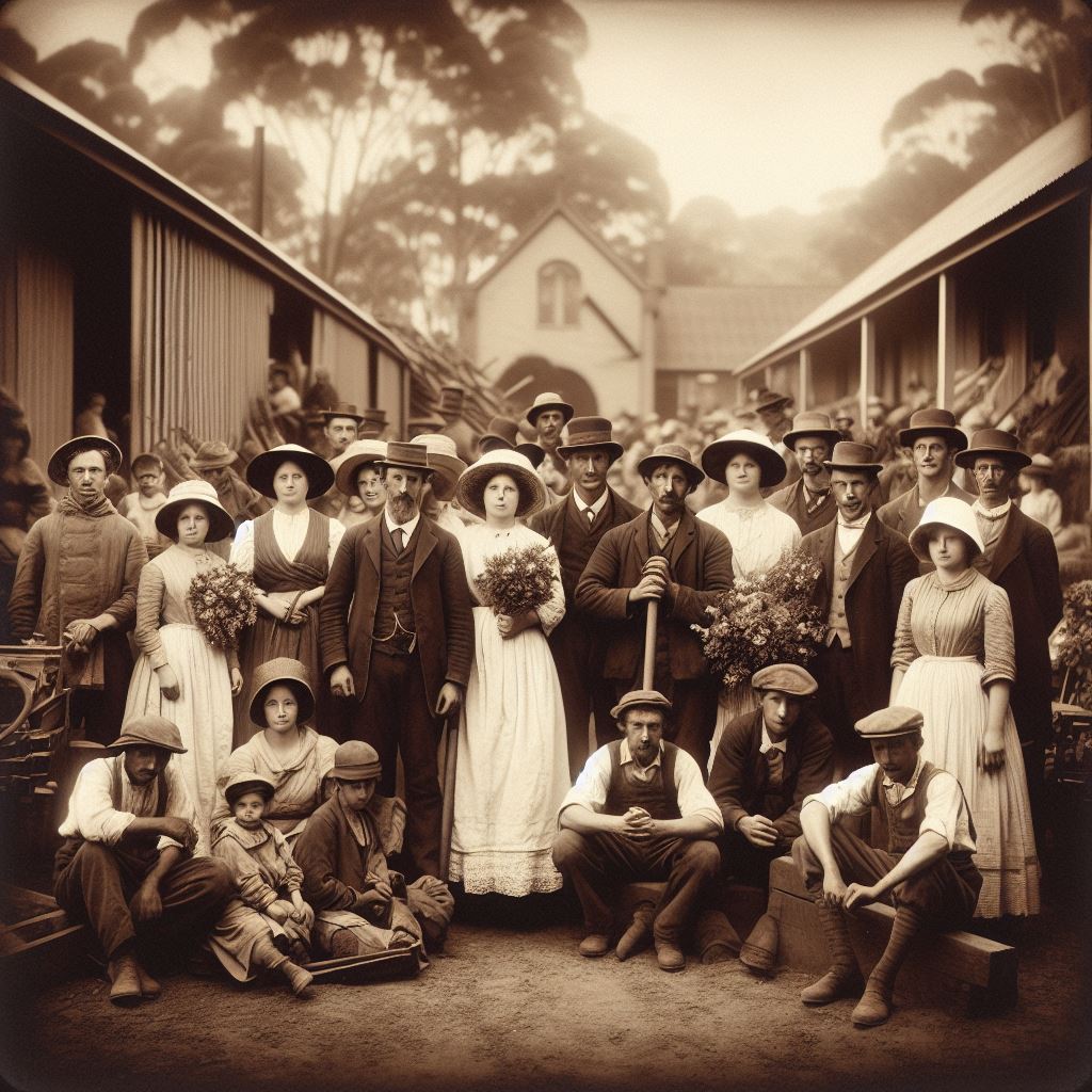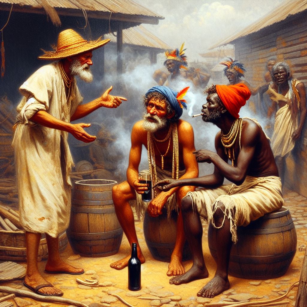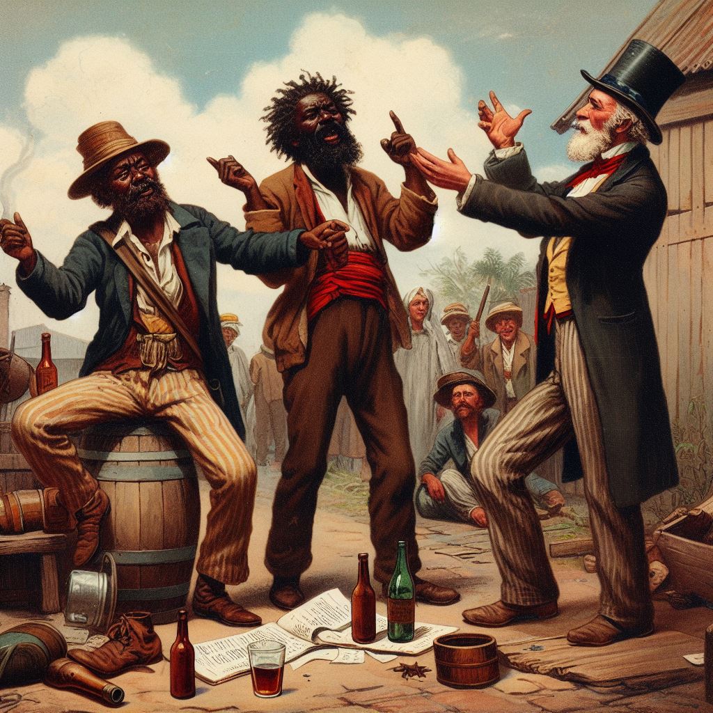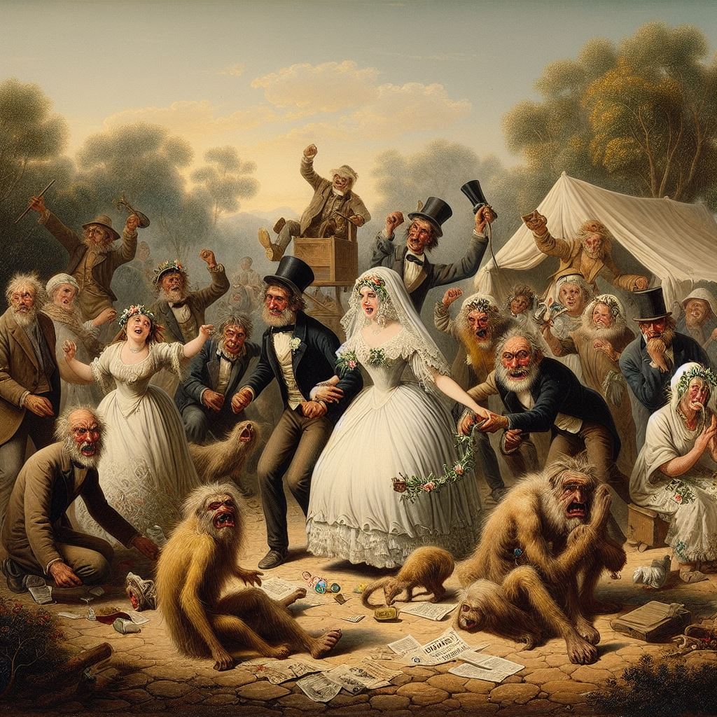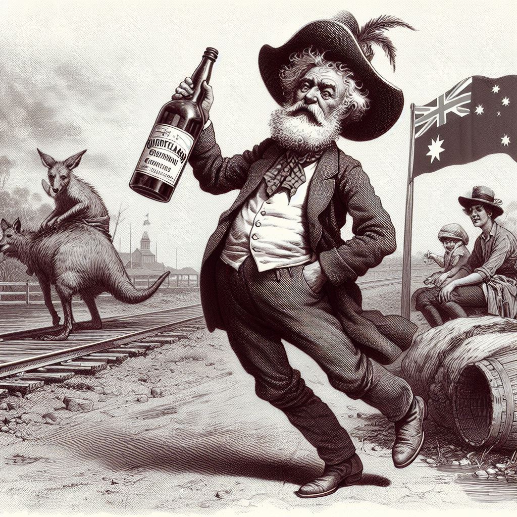 The first story, that of the drunken man who sells his horse for too little, then argues with the buyer and her friend, made me think that “two harridans arguing with a drunk man, 19th century Australia” might be a good starting-off point. I don’t think that AI quite knew what a harridan was. Here are the results: