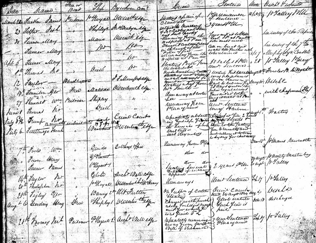 James Turner was transported to Sydney on the Prince Regent, arriving on 27 January 1820, and was then transferred to Hobart Town on the Castle Forbes. The second journey would have been an interesting one – one of his shipmates was Alexander Pearce, whose stay in Van Diemen’s Land was punctuated by escapes, thefts, murder and cannibalism.