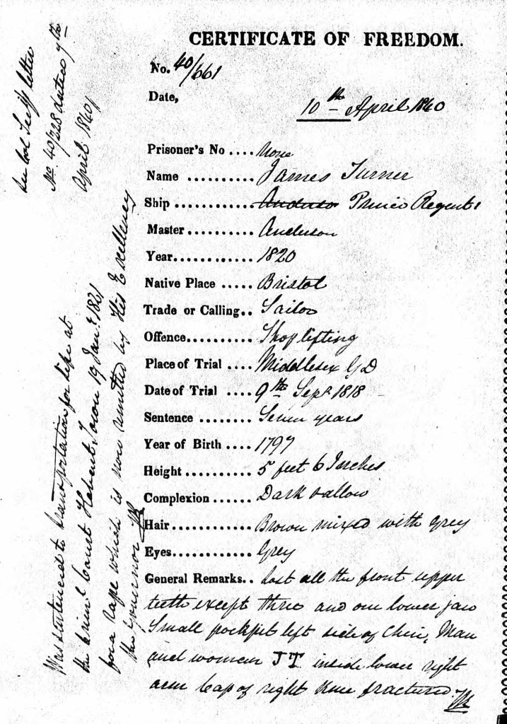 After a lot of marginal notes and referrals back and forth in Sydney, the Principal Superintendent of Convicts was instructed to take their physical descriptions and prepare free pardons for their Colonial offences. And thus, both men were granted Certificates of Freedom. In his 22 years in custody, James Turner had lost all but four of his teeth, had gone grey, and had a broken kneecap (and no doubt a pronounced limp). He was 41 years old.