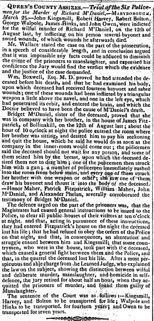 Harvey was one of six Irish policemen who had been convicted of manslaughter at Queen’s County on 25 March 1824. It was an arrest that had gone horribly, fatally wrong in a time when police officers carried bayonets and swords. (On reflection, it does seem a rather over-rigorous enforcement of pub closing regulations…).