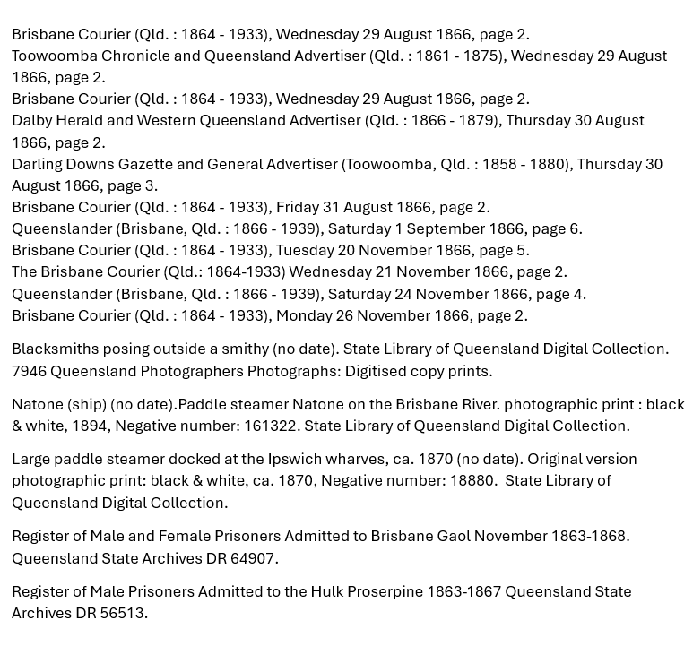 We know very little about William Domane, beyond what was recorded in the Admission Registers for Brisbane Gaol and St Helena Island. Domane was a free emigrant, a blacksmith originally from England. He gave his birth year as 1835, making him 31 at the time of the offence. He was 5 feet 8 ½ with a medium build. He had brown hair, sandy whiskers, and hazel eyes. His complexion was fresh, but marked by two scars near his left eye – one on the eyebrow was described as a deep scar. He was described as orderly in Brisbane Gaol. He was sent to the Hulk Proserpine, and was then forwarded to the brand-new penal establishment at St Helena. He did his time, had no disciplinary record in custody, finished his sentence, and left.