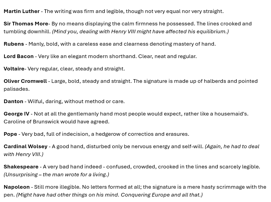 The handwriting of eminent persons had been analysed by an expert, and the findings were mixed for the big figures of European history.