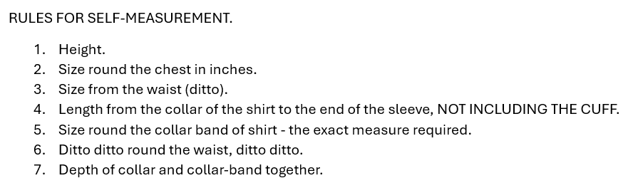 Smiths’ Colonial Shirt Manufactory (of Sydney, mind) was aware that “At this season of the year it is usual for gentlemen to replenish their Winter Wardrobe.” They offered instructions for gentlemen in far-flung parts of the colony to measure themselves for a shirt. “If the instructions for measurement are strictly complied with, Messrs JT and W Smith undertake to produce a Shirt to fit any figure that Nature in her wisdom has given to man.”[iii] A gentleman would record his measurements thus: