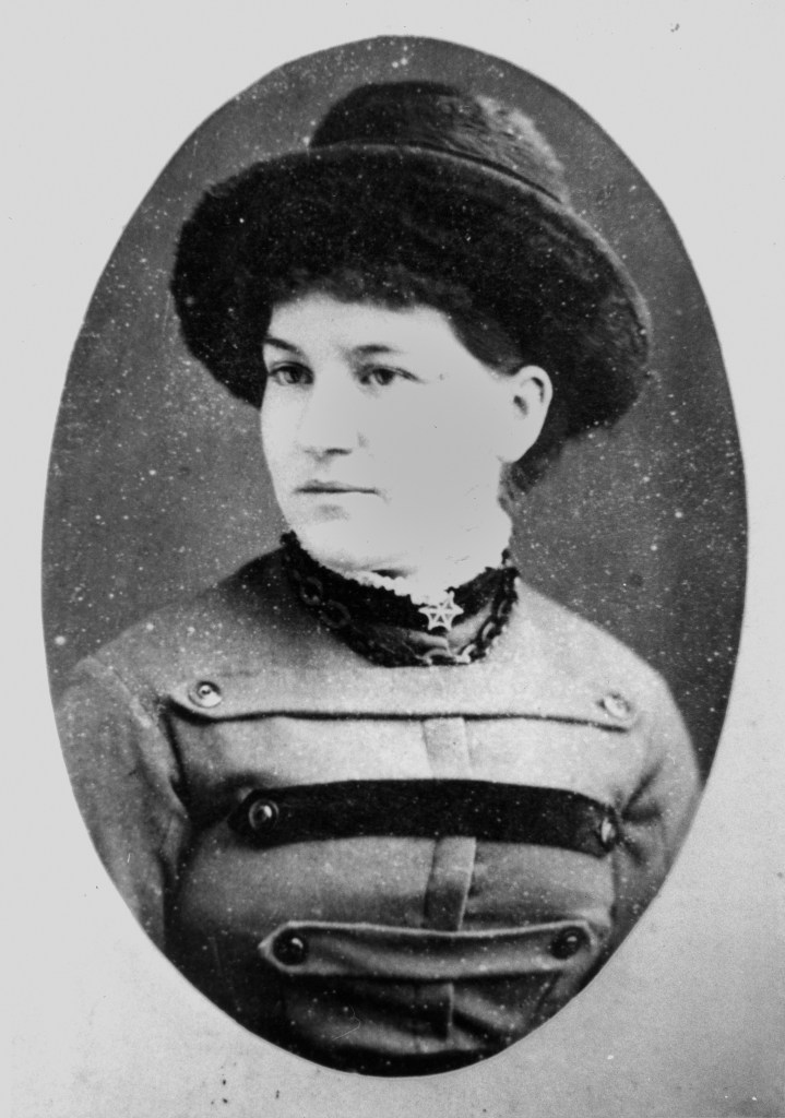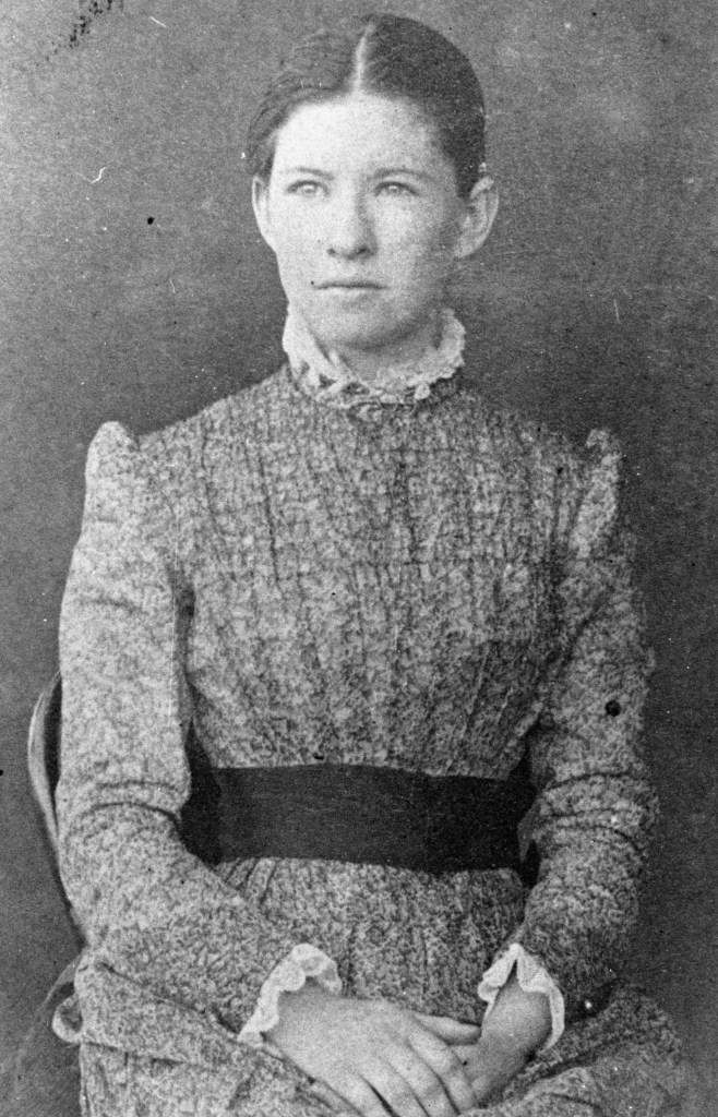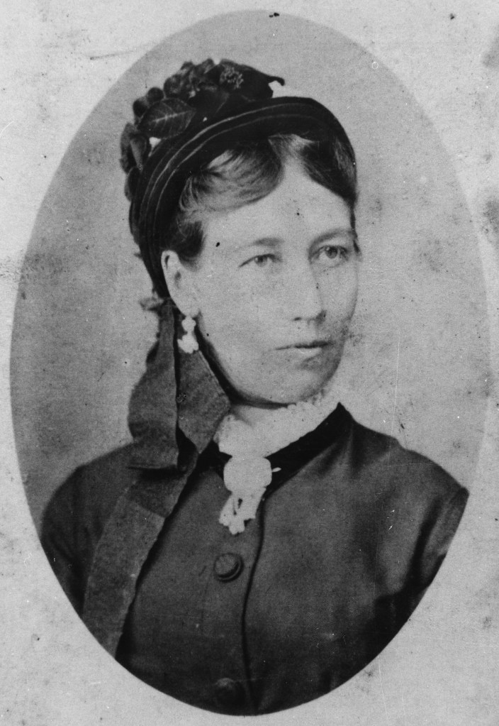 Left: Mary Ann Low, in 1877, wearing a bonnet trimmed with lace and feathers, anchored by a brooch. She doesn’t look at all happy about it.