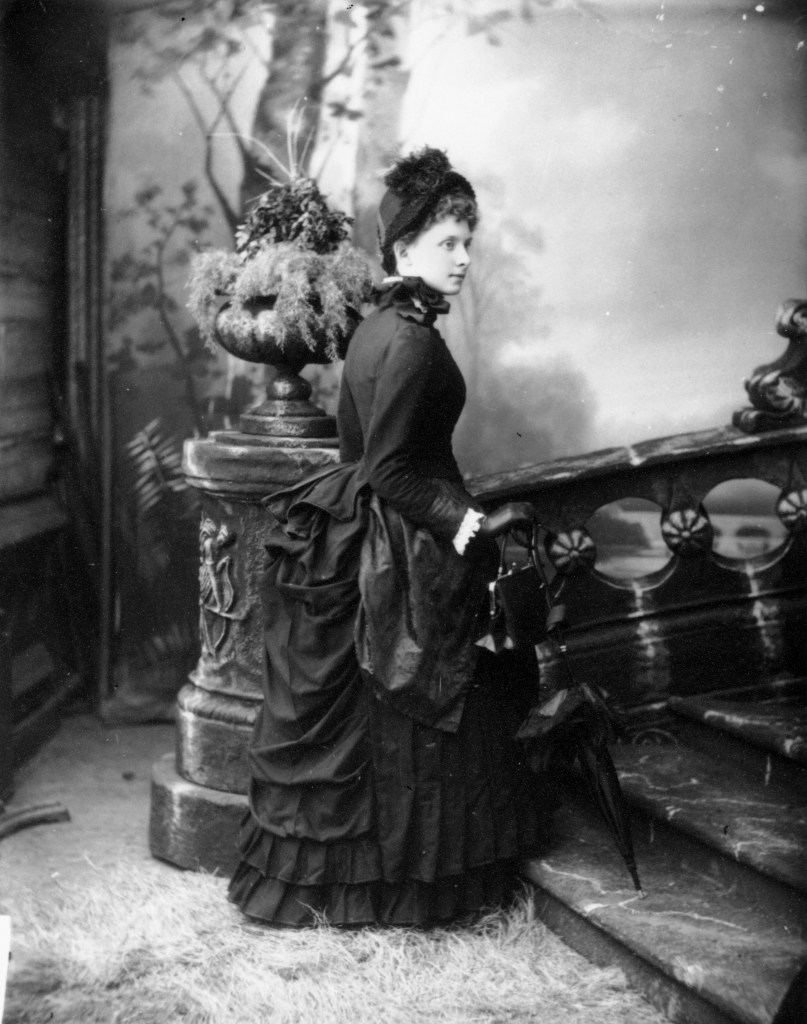 Left: Mrs Jessie Agnes Poulsen, wife of the photographer, modelling the fashions of 1885. Possibly all of the fashions of 1885. She wears a feather-trimmed bonnet with an elaborate bow at the neck. Her costume includes a bustle draped in lightly ruffled fabric, long, lace-trimmed sleeves, tight leather gloves, an over-skirt, a pleated skirt front underneath that, and, finally, ruffles at the hem. She carried a small ladies’ bag and an umbrella as she posed at the foot of the stairs. Presumably, she was concerned about cold, rain, and running out of cash whilst indoors.