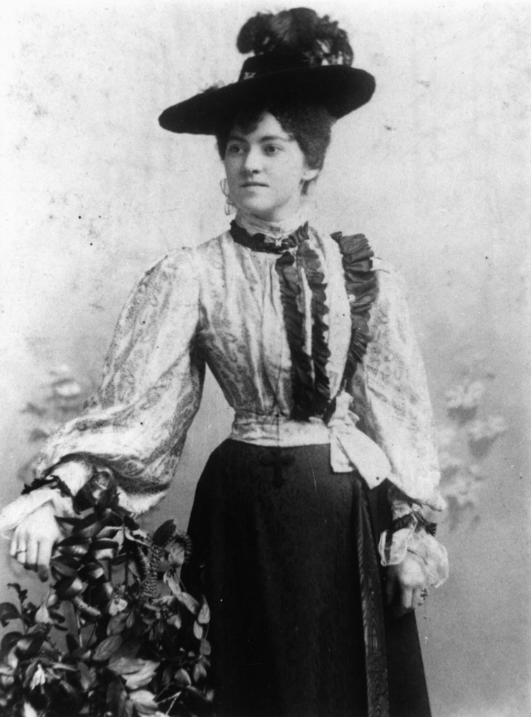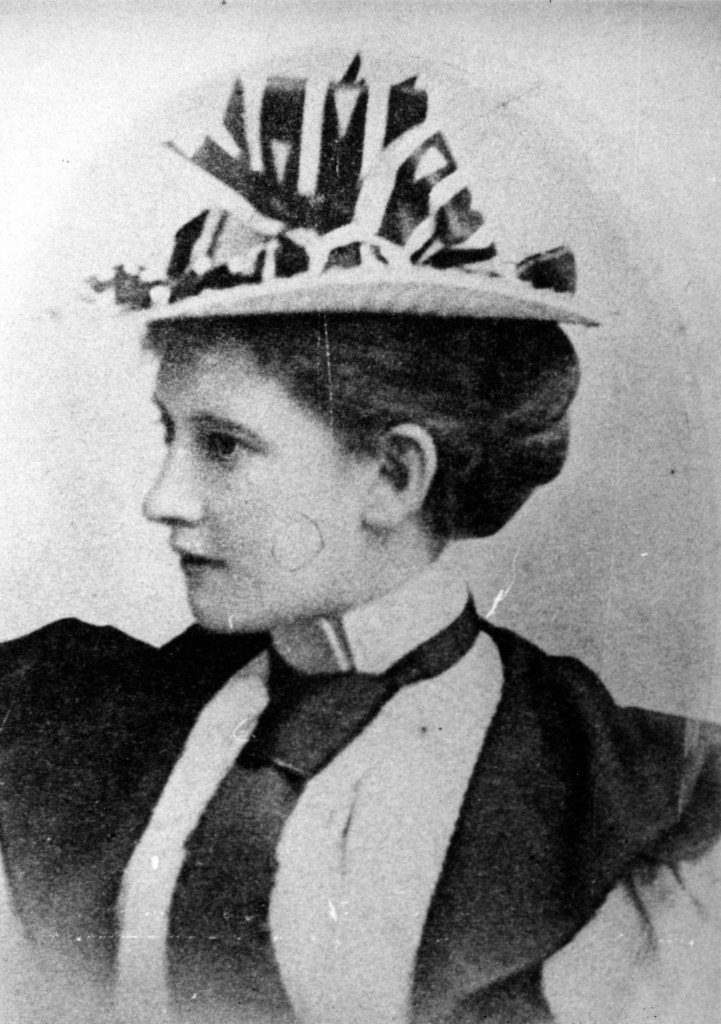 Left: Lilie Stevenson wears a be-ribboned straw hat in 1894. It takes a good deal of flair to wear the combination of a man’s tie plus outre millinery confection