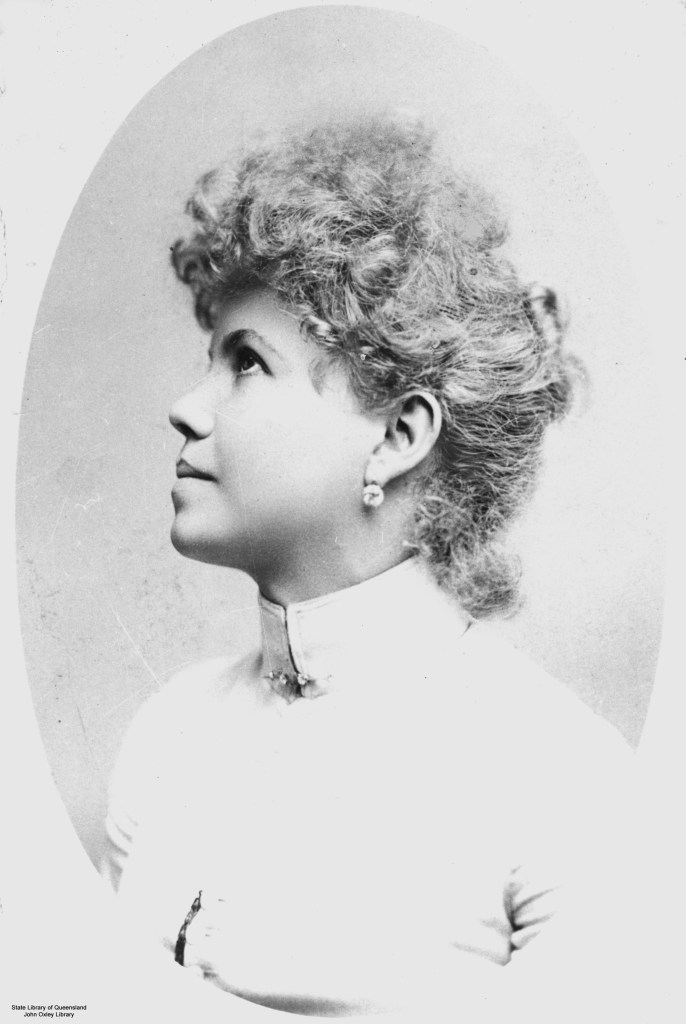 Right: Mrs J. Park of Oakpark Station wears a small bonnet on the crown of her head in 1878. One did not, I suspect, mess with Mrs J. Park. Her taste in home decoration was fairly striking: “A stuffed crocodile is among the bric-a-brac under the Oak Park verandah, along with agates, stalactites and mineral specimens, nestling among the ferns and orchids of the bush house, surrounded by beds of violets.” (The Northern Miner).