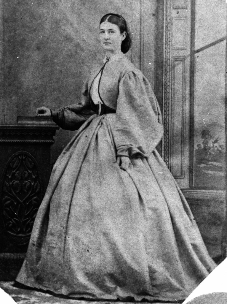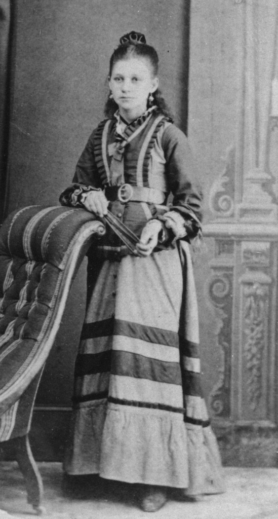 Right: Jane Graham posing with a sprig of wild flowers, 1877. This seated portrait blurs the skirt, but the fringed lacy neck bow and gathered sleeves with long tassels reflect the elaborate clothing of the era.