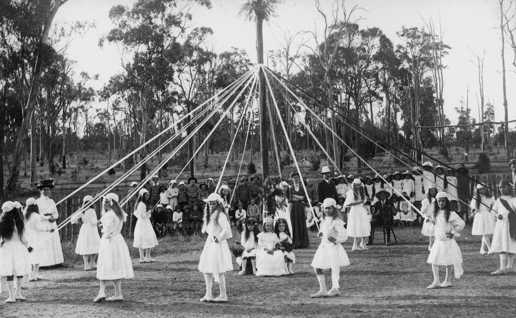 Children maypole dancing, 1900-1910. Details: Original version photographic print : black & white, 1900-1910, Negative number: 62312. State Library of Queensland.