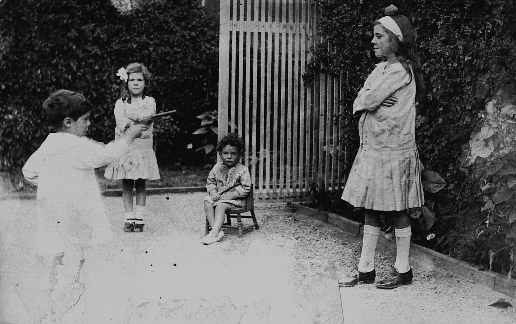 Children playing a game in a yard, ca. 1900. Details: Original version photographic print : black & white, ca. 1900, Negative number: 146136. State Library of Queensland.