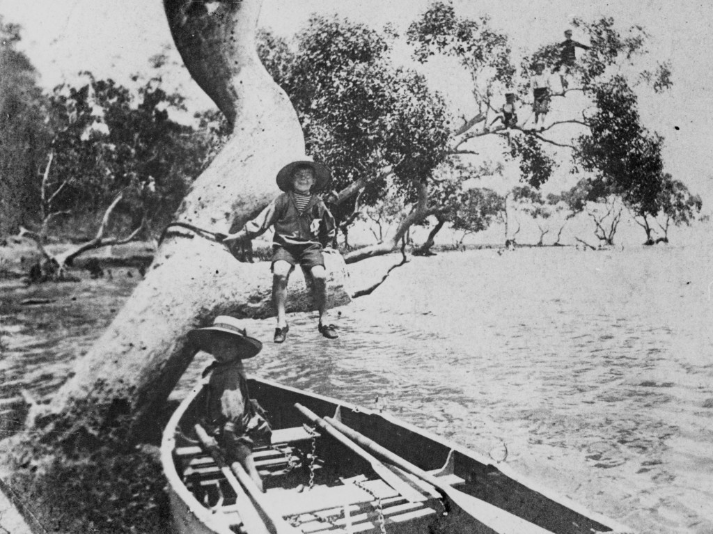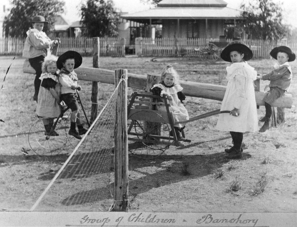 Children playing at Banchory, Queensland, 1890-1900. Details: Original version photographic print : black & white, 1890-1900, Negative number: 47736. Please attribute State Library of Queensland.