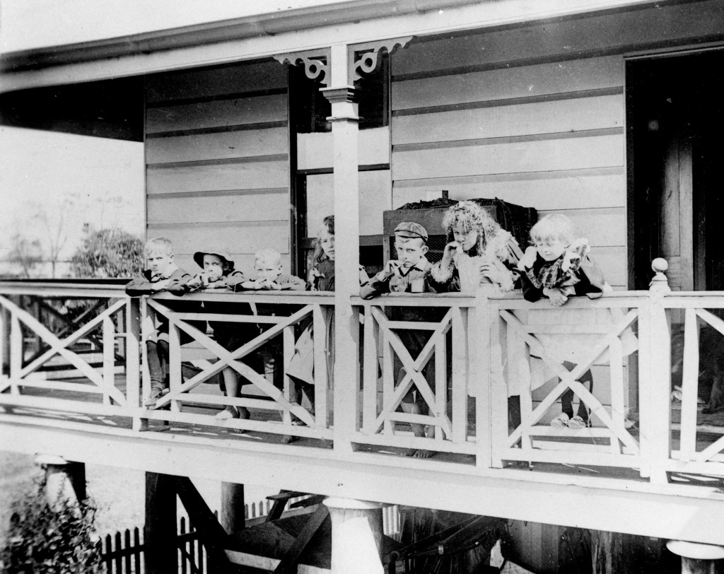 Group of children blowing bubbles from the verandah of the Charles Allen Brown residence in Maud Street Newstead Terrace, Brisbane, in the 1890s. Details: Original version photographic print : black & white, 1890-1900, Negative number: 11154. State Library of Queensland.