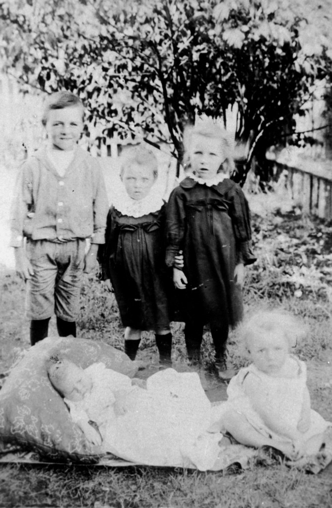 Portrait of five children in a yard, 1900-1910. Details: Original version photographic print : black & white, 1900-1910, Negative number: 54685. State Library of Queensland.