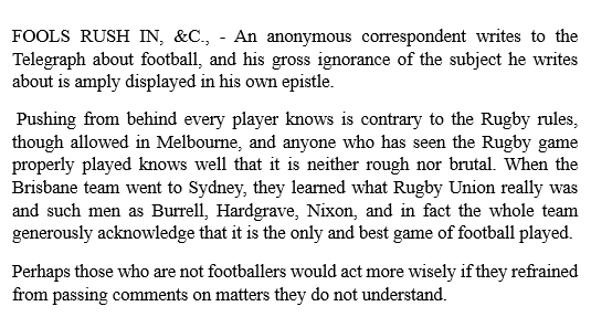 In May 1883, a person using the nom de plume “Bamboos” penned a letter to the Editor of the Telegraph, suggesting that Rugby was simply too rough and should be discontinued in favour of Melbourne football: