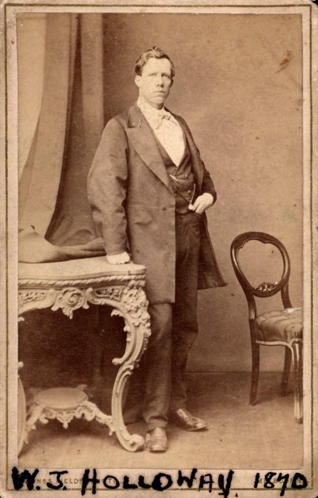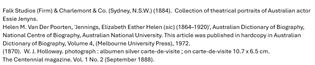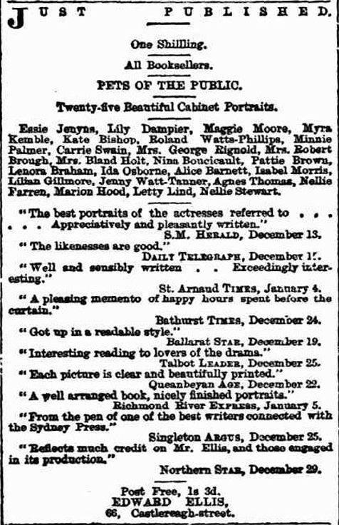 [i] Oddly, though, there was an actress named Kate Arden active in Sydney in 1866. At first, the artist seems to be an imported performer, but this advertisement suggests otherwise: BENEFIT TO MISS KATE ARDEN. – A complimentary benefit to Miss Kate Arden (Mrs C Jennings) is announced for tomorrow (Thursday) evening, to be given at the Masonic Hall by the Amateur Backus Minstrels. The programme states that the entertainment is to be patronised by the Premier, members of the Ministry, and the Mayor and Aldermen of Sydney. (Sydney Morning Herald, 1866.) Perhaps Mrs C Jennings went on stage during her marriage to Charles. In which case, as an actress, she might have had the opportunity to spot the rising talent, WJ Holloway, in Brisbane in the 1860s.