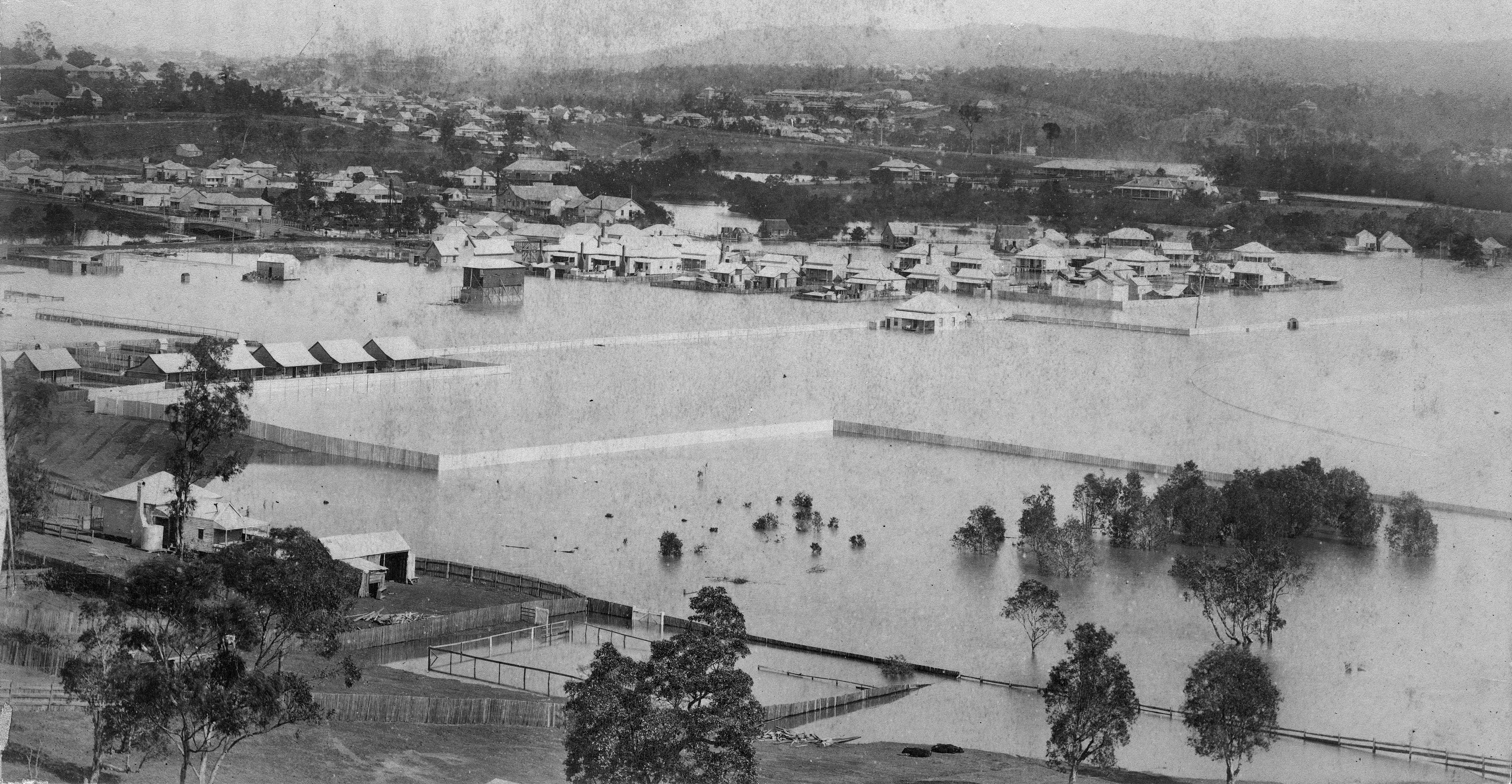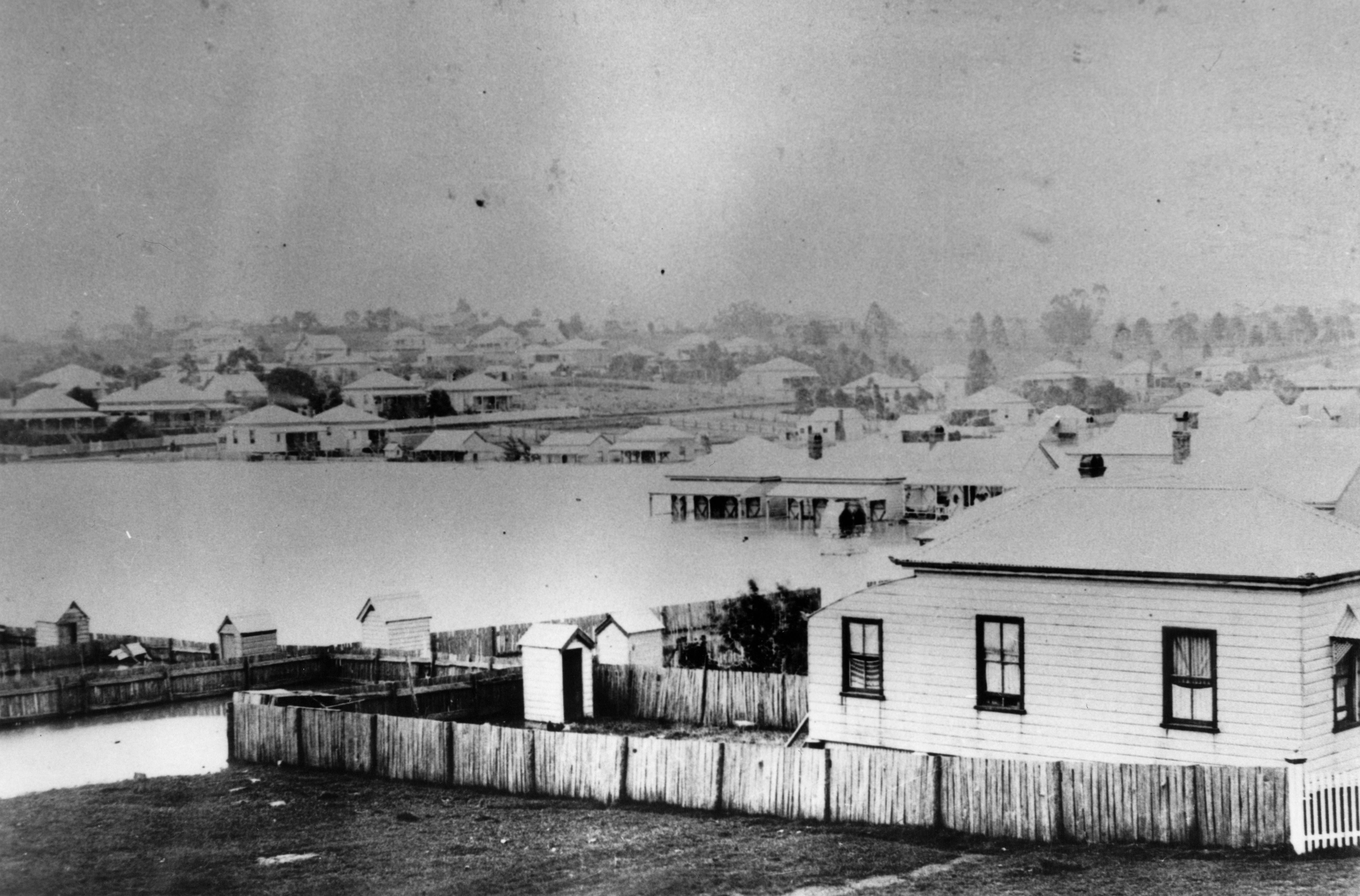 Left: Mr J Jordan’s residence in Stoneleigh Street. Right (top): Floods at Albion. Right (bottom): Albion Park Racecourse in flood in 1890.
