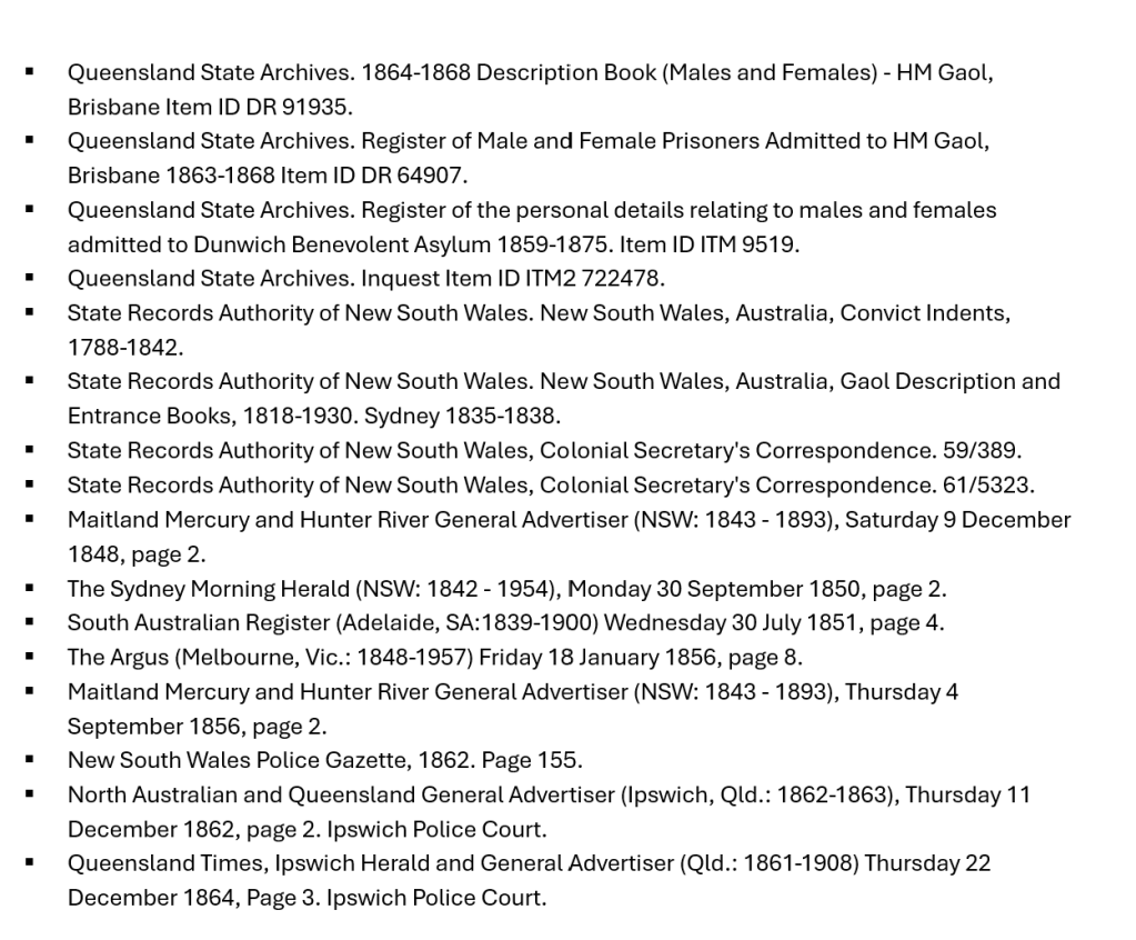 Freeman went to Maitland, where he remained until his Pardon was granted in September 1850. It was “available everywhere, save in the UK of Great Britain and Ireland, and Bombay.” He was free to go outside the Maitland district, and he tried his luck on the diggings before going back. He remained there, only racking up a fine or two for being drunk. As he aged, work became scarce, and he tried his luck in the new Colony of Queensland in 1861.