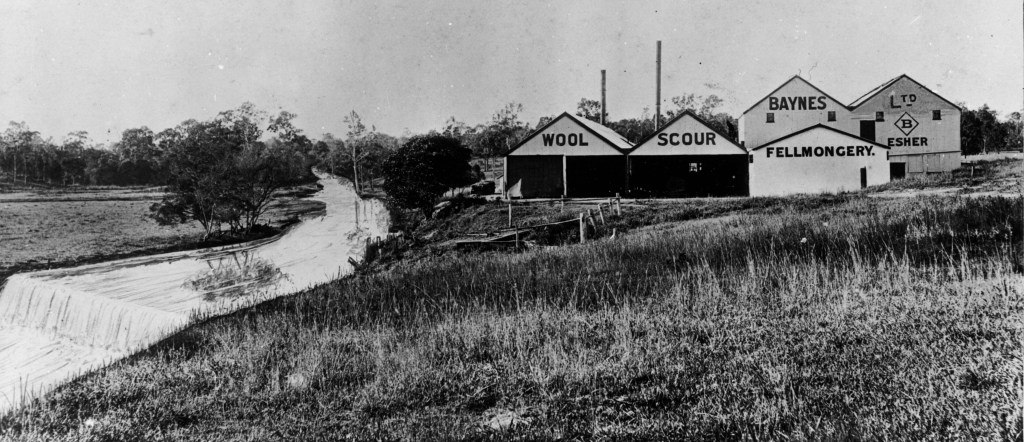 Baynes’ Fellmongery and Wool Scour at Belmont, Brisbane, ca. 1910. Original version: photographic print: black & white, ca. 1910, Negative number: 22206. Summary: Baynes Wool Scour and Fellmongery situated next to Bulimba Creek. State Library of Queensland.