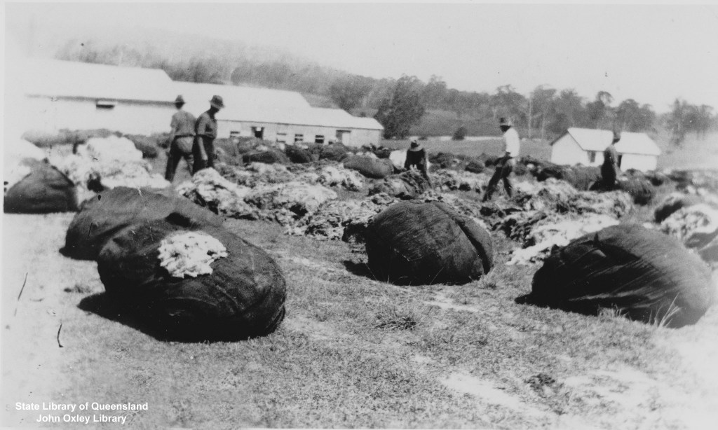 Above left: Sorting wool at Belmont Wool scour, Queensland, 1900-1910. Original version: photographic print: black & white, 1900-1910, Negative number: 168815. Summary: Workers sorting wool at the Belmont wool scour in the early 1900s. Large bales are open revealing the fleece. State Library of Queensland.