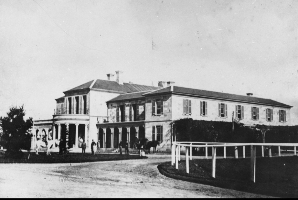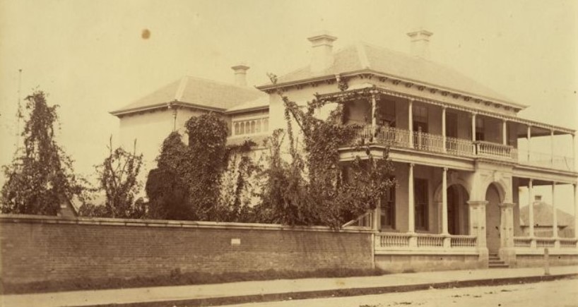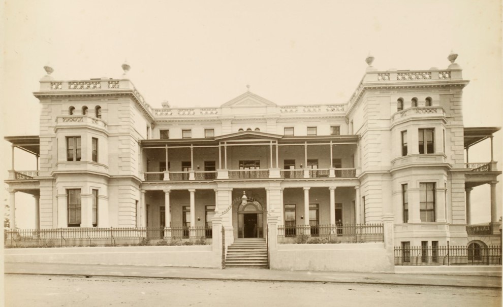 A helpfully-labelled early view of George Street.Buildings along George Street, including James Davis’ shop, 1880s.Government House, George Street, 1867.Harris Terrace, corner George and Margaret Streets.Parliament House and the first Bellevue Hotel.